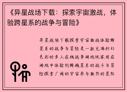 《异星战场下载:探索宇宙激战,体验跨星系的战争与冒险》是一款充满科幻色彩的多人在线战争游戏。玩家将在游戏中体验到跨越星系的战斗与冒险,探索广阔的宇宙,参与激烈的星际战争,组建强大的战斗舰队,与其他玩家展开激烈对抗。游戏通过其丰富的宇宙背景设定、创新的战斗模式、深度的策略元素以及高度自由的探索体验,吸引了大量喜欢科幻与战争游戏的玩家。本文将从宇宙设定与背景、战斗系统与策略、游戏模式与玩法、以及探索与冒险四个方面对《异星战场》进行详细阐述,帮助读者全面了解这款游戏的魅力。